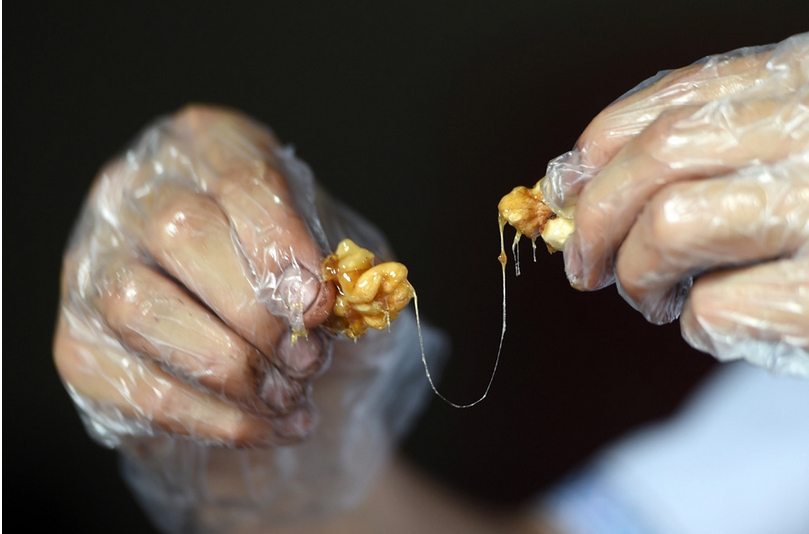 El joven emprendedor revisa la viscosidad del caramelo en el taller de Changsha, en la provincia de Hunan, el 22 de mayo de 2014. [Foto/Xinhua]