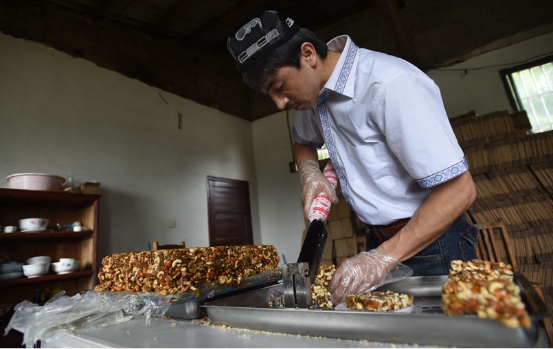 Adili muestra un trozo de Qiegao con forma de corazón en el taller de Changsha, en la provincia de Hunan, el 22 de mayo de 2014. Ofrecen productos personalizados a los clientes. [Foto/Xinhua]