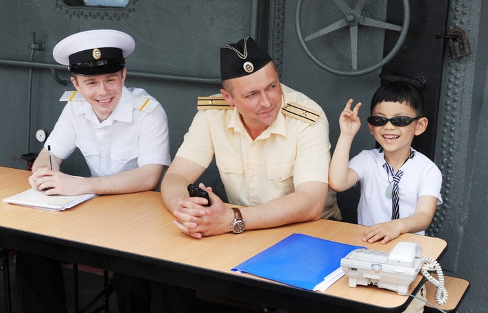 Un ni?o, posa con miembros de la tripulación del buque ruso el lunes. [Foto/IC]