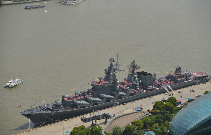 El destructor de misiles ruso Varyag atraca en la terminal de cruceros del puerto internacional de Shanghai el lunes. [Foto/IC]