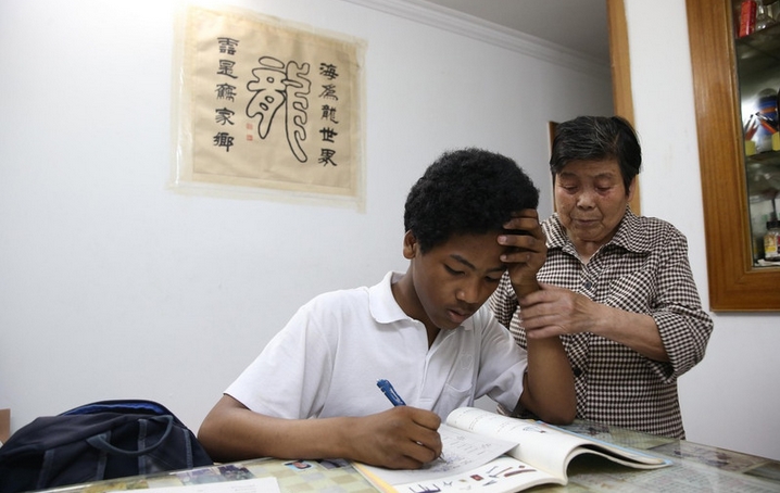 Zhu Junlong hace sus tareas en casa mientras Zhu Shuibao lo observa, el 29 de mayo de 2013. [Foto/IC]