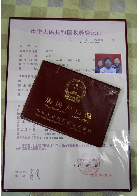 Zhu Junlong, un joven adoptado de 15 a?os en Shanghai, obtuvo su certificado de registro familiar el 14 de mayo de 2014. [Foto/IC]