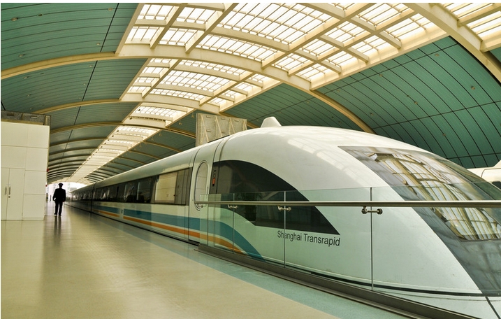 El tren Maglev de Shanghai conecta el aeropuerto internacional Pudong de Shanghai con el metro de Shanghai. Ha registrado una velocidad máxima de 311 m/h y su velocidad media de crucero es de 268 m/h, convirtiéndolo en el tren comercial más rápido del mundo.