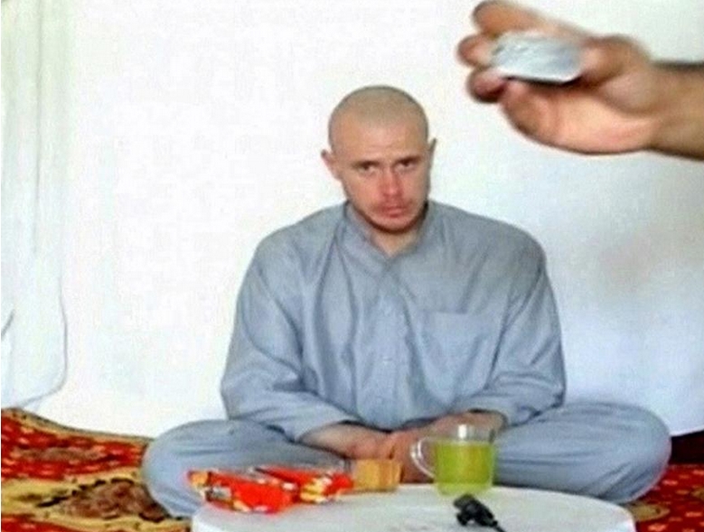 El soldado estadounidense Bowe Bergdahl observa como uno de sus captores muestra su placa de identidad a la cámara en un lugar desconocido de Afganistán el 19 de julio de 2009. Bergdahl, cautivo durante casi cinco a?os a manos de los talibanes en Afganistán, ha sido liberado y ya se encuentra en Estados Unidos después de a?os de negociaciones, según informaron funcionarios de Estados Unidos el 31 de mayo de 2014. [Foto/agencias]