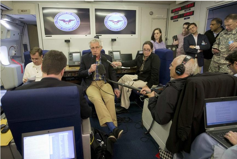 El secretario de Defensa de Estados Unidos Chuck Hagel habla durante su vuelo al extranjero en un avión militar de Estados Unidos el 1 de junio de 2014. Hagel, de viaje por Asia, dijo en un comunicado que el sargento Bowe Bergdahl, tendrá "todo el apoyo que necesite para adaptarse y recuperarse de esta terrible experiencia, y estamos agradecidos de que pronto se reencontrará con su familia". [Foto/agencias]