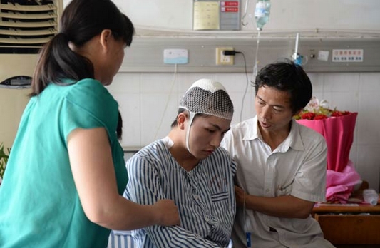 Liu Yanbing, un estudiante de secundaria de Yichun, provincia de Jiangxi, es atendido por sus padres en un hospital local. Quedó gravemente herido el 31 de mayo cuando se enfrentó a un hombre que amenazó con cuchillo a los pasajeros de un autobús. Wu Zhonghao / Xinhua
