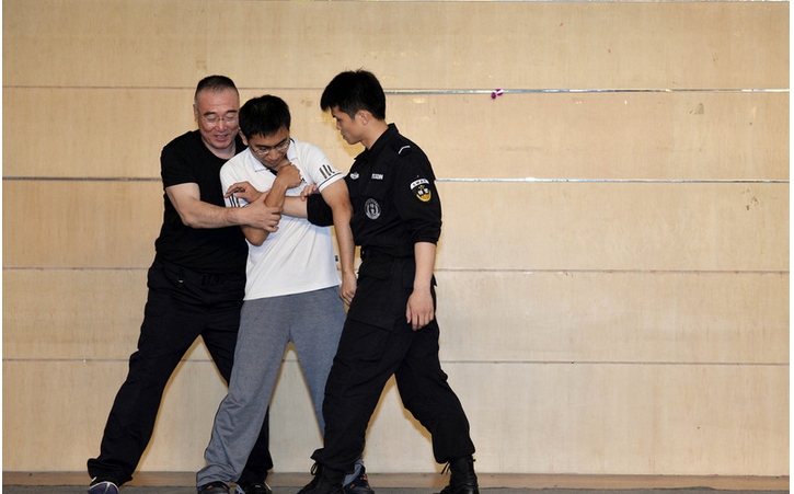 Un estudiante universitario recibe una demostración de ataque con pu?o durante una conferencia sobre técnicas en defensa contra ataques terroristas en la la Universidad de Economía y Negocios de Pekín, el 11 de junio de 2014. [Foto/IC]