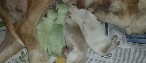 Desde la clínica veterinaria han confirmado el excepcional nacimiento y apuntan a una enfermedad "vírica o bacteriana" como posible causa de su tono de piel. El origen de este verde podría ser, tal y como apuntan desde la clínica, la biliverdina. Este pigmento, que suele ser de color verde o azul, se puede encontrar en la cáscara de los huevos de las aves, en la sangre de muchos peces y, entre otros, en la placenta de los perros.