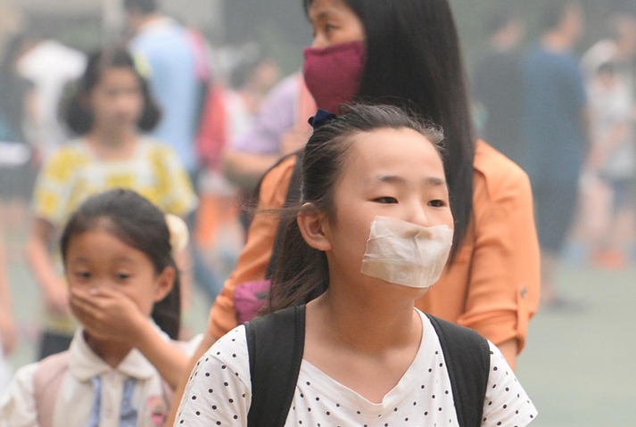 Una ni?a se cubre la cara con una servilleta de papel en un colegio de Wuhan, el jueves. [Fotografía de Jin Siliu/Asianewsphoto]