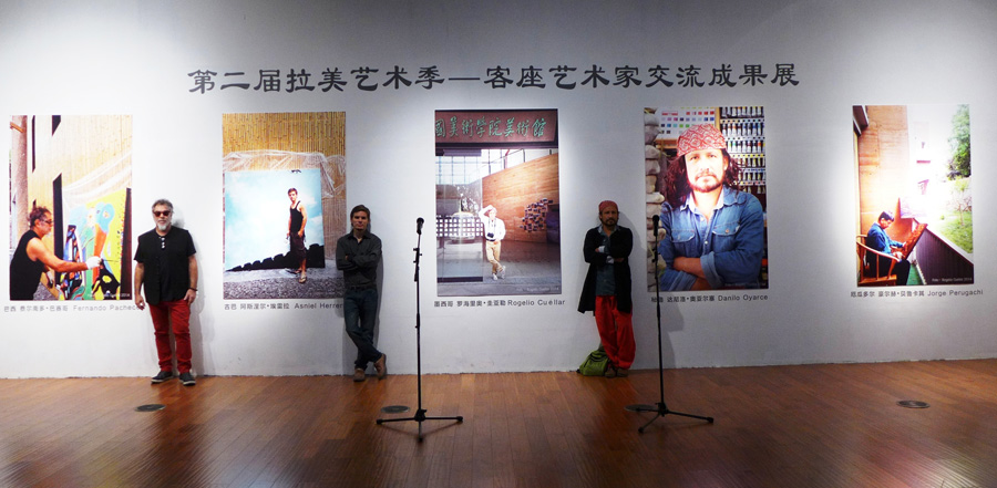 El artista visual cubano Asniel “Chuli” Herrera junto a los colegas Fernando Pacheco, de Brasil, y Danilo Oyarce, de Ecuador.