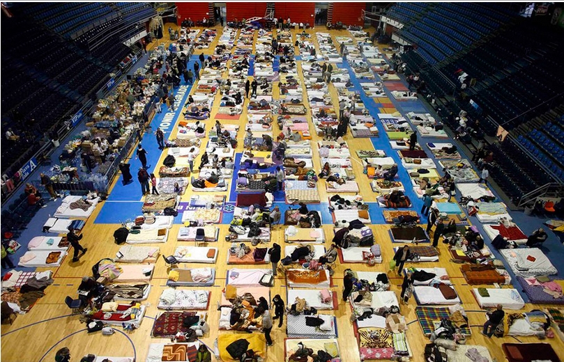 Los evacuados de la ciudad serbia de Obrenovac duermen en camas en un centro de refugio de Belgrado, 18 de mayo de 2014. Dos aviones de carga ruso con alimentos, generadores y botes de rescate aterrizaron en Serbia como parte de una ayuda después de las peores inundaciones en más de un siglo, en las que murieron más de 20 personas en los Balcanes. [Foto/CFP]
