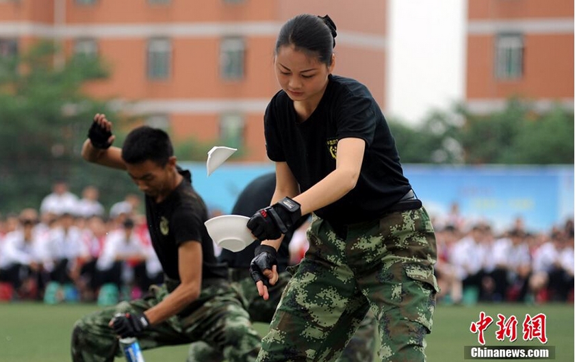 El primer grupo antiterrorista y antimotines de China realiza un simulacro en el campus de la Facultad East Star Airlines Travel de Chengdu el0 de junio de 2014. El equipo consta de 80 ni?os y 40 ni?as, todos estudiantes de la facultad. [Foto/chinanews.com]