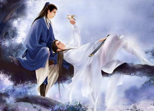 Una pintura de una historia tanbi muestra el romance entre dos hombres guapos. [Foto de WeiXiaohao / China Daily]