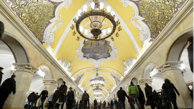La estación Komsomólskaya de Moscú posee una cúpula gigantesca, columnas corintias y ocho mosaicos en el techo realizados por el destacado artista Pavel Korin, que representan a los héroes rusos.