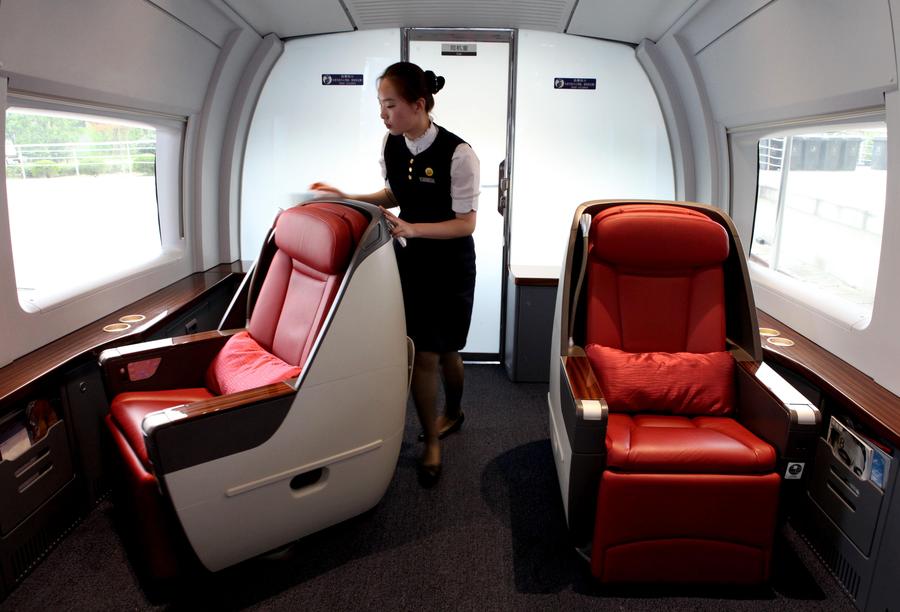 Una azafata ajusta un asiendo del tren de alta velocidad CRH D319 Pekín-Shanghai que sale desde la estación ferroviaria sur de Pekín, capital de China, el 30 de junio de2014. La ruta Pekín-Shanghai (o Jinghu) celebró su tercer aniversario el lunes. El tren de alta velocidad de 1.318 kilómetros une Pekín y Shanghai. Más de 220 millones de pasajeros han realizado este viaje desde que se abriera la ruta el 30 de junio de 2011.
