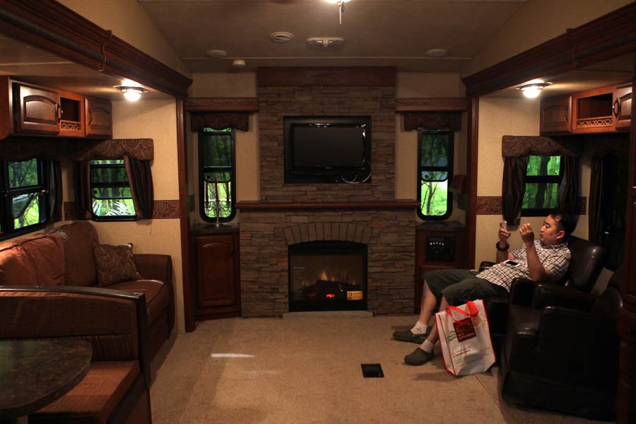 Un hombre descansa dentro de una caravana.
