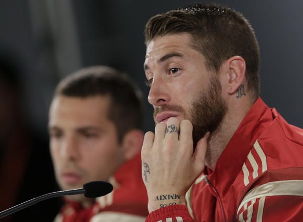 Sergio Ramos, jugador de la selección espa?ola (derecha) junto a su compa?ero de equipo Jordi Alba durante una conferencia de prensa en Brasil. El defensor espa?ol Sergio Ramos tiene un tatuaje que dice "lobo", en mandarín, justo detrás de la oreja izquierda.