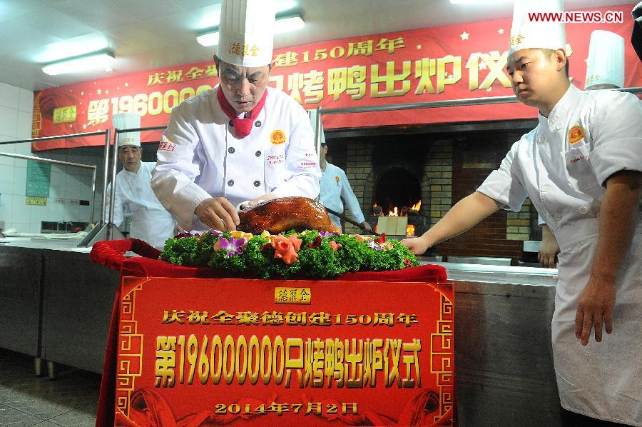 El jefe de cocina Zheng Zhiqiang prepara el pato número 196 millones durante la celebración del 150 aniversario del restaurante de pato laqueado Quanjude de Qianmen, en Pekín, el 2 de julio de 2014.