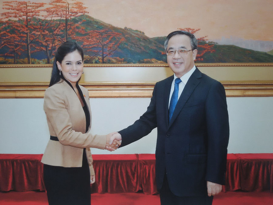 Mariella Molina, cónsul general de Ecuador en Guangzhou saluda a Hu Chunhua, secretario general del Partido Comunista de Guangdong, durante un encuentro con delegaciones consulares.