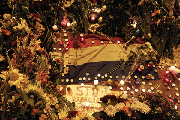Flores y velas para las víctimas del accidente del avión 777. En esta tragedia fallecieron los 295 pasajeros que estaban a bordo.