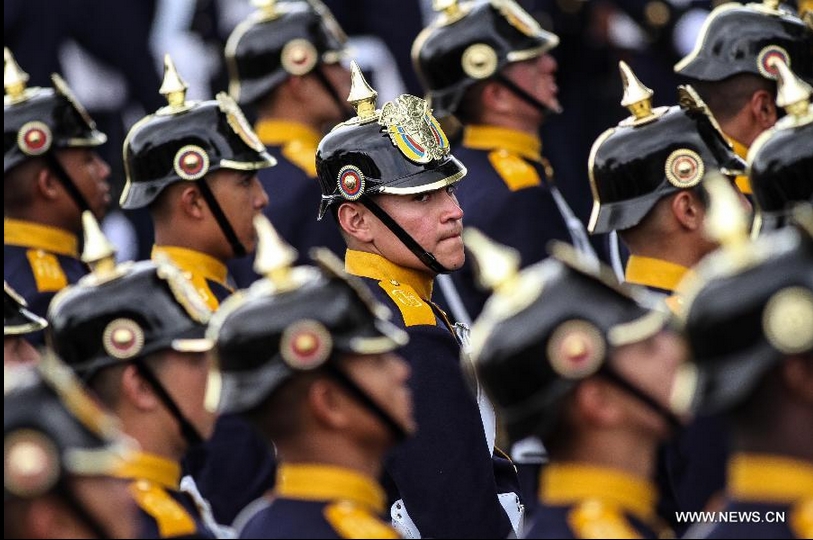 Cadetes de las fuerzas armadas participan en el desfile militar anual para conmemorar el Día de la Independencia, en la ciudad de Bogotá, capital de Colombia, el 20 de julio de 2014. (Xinhua/Jhon Paz)