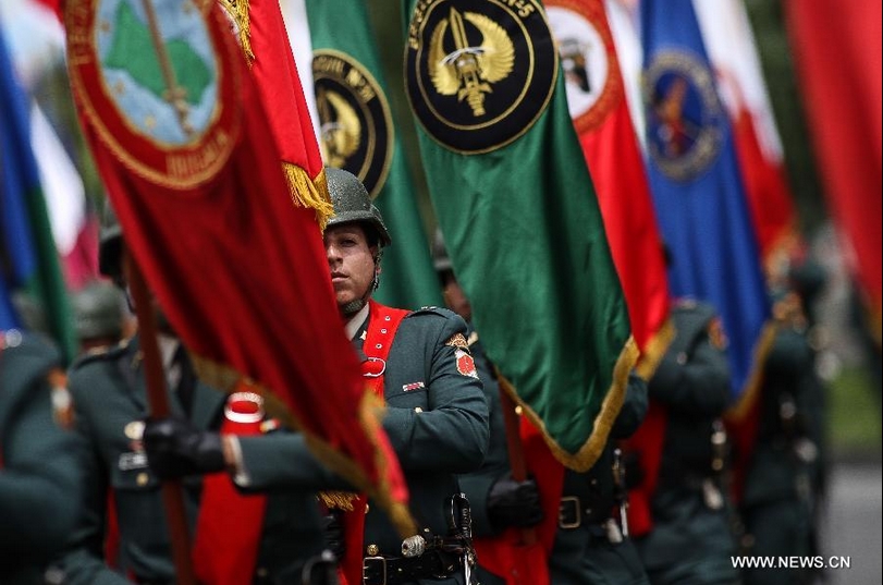 Un cadete de las fuerzas armadas sostiene una bandera en el desfile militar anual para conmemorar el Día de la Independencia, en la ciudad de Bogotá, capital de Colombia, el 20 de julio de 2014. (Xinhua/Jhon Paz)