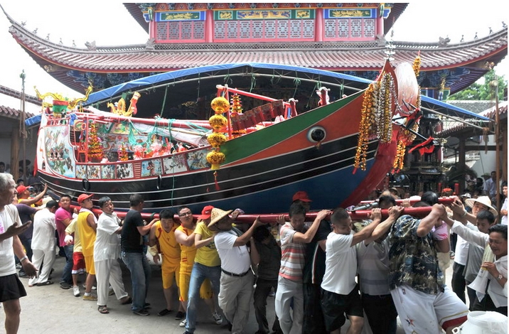 El barco está lleno de animales que servirán como sacrificio: cerdos, ovejas, pollos, peces y mariscos. Más de 50 pescadores se turnan para llevar lel barco en procesión por las calles. La gente toca los tambores y quema fuegos artificiales. Ambos lados de la calle están llenos de gente que reza y pide bendiciones.