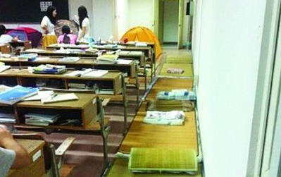 Colchonetas y pijamas yacen en el aula donde pasarán una noche fresca, el 23 de julio de 2014.