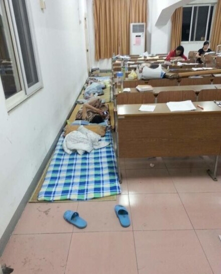 Nanjing, 25/07/2014(El Pueblo en Línea)-Los estudiantes del campus Monta?a Wutai de la Universidad de Medicina de Nanjing en Nanjing, provincia de Jiangsu, se han llevado tiendas de campa?a y colchonetas a sus aulas con aire acondicionado en estos días en los que las temperaturas hacen la estancia en los dormitorios sofocante, donde no hay aire acondicionado, el 23 de julio de 2014.