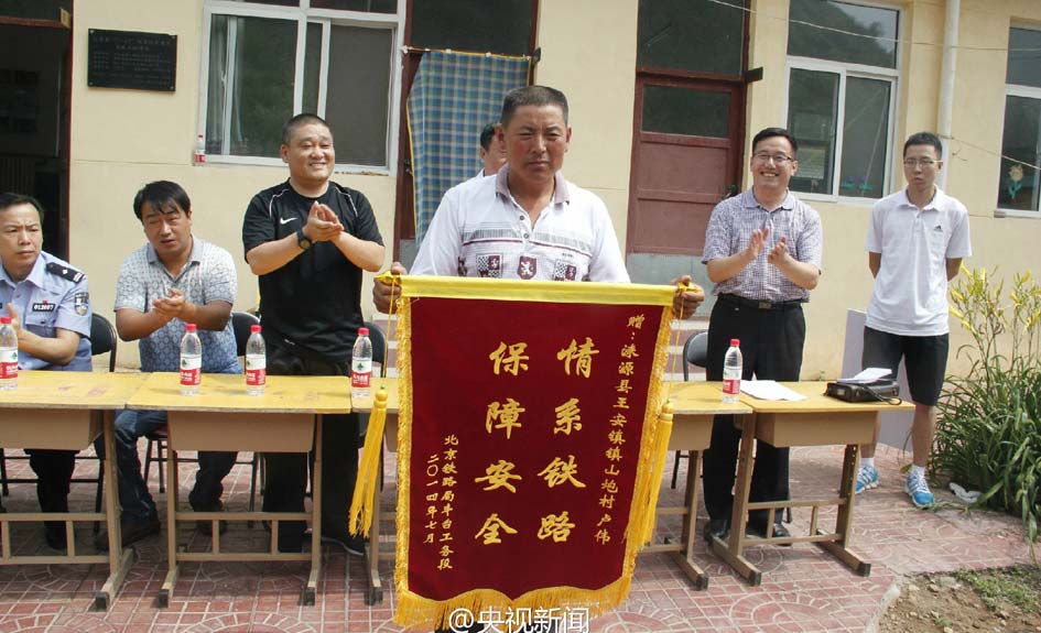 Hubei, 28/07/2014(El Pueblo en Línea)-Hace pocos días, llovió a cántaros en la zona monta?osa del municipio Laiyuan, Hubei. Esto causó un grave alud que sumergió una gran parte del sistema de ferrocarriles del pueblo Wanganzhen, en Jinyuan. Cuando ocurrió el incidente, un tren llegaba al pueblo y un campesino -que estaba cerca- inmediatamente corrió hacia el tren mientras le gesticulaba al conductor. Su decisión logró que el tren parara a tiempo y de esta forma, evitó un grave accidente. Aplaudimos la valentía de este campesino!(Wang Shuainan)