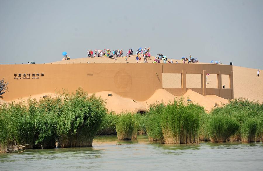 Shahu, 29/07/2014(El Pueblo en Línea)-Los turistas visitan un museo de humedales en el área escénica del Lago Shahu en región autónoma Hui de Ningxia, el 27 de julio de 2014. Comienza la temporada de verano, y durante este periodo, el Lago Shahu y los humedales del desierto esperan recibir 20.000 visitas turísticas al día.