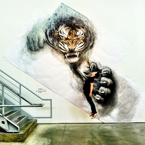 Mural dibujado por Fiona Tang, donde parece que el animal sale de la pared.