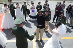 Un policía fronterizo pakistaní baila con los novios en la boda en grupo celebrada en Khunjerab, en la región autónoma Uygur de Xinjiang, el 30 de julio de 2014. Los novios, que trabajan para la policía fronteriza de Khunjerab, han custodiando la frontera entre China y Pakistán desde hace muchos a?os. [Fotografía por QianqingTang / para chinadaily.com.cn]