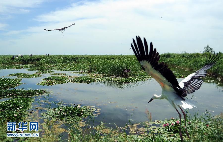 Daqing, 04/08/2014(El Pueblo en Línea)-El 3 de agosto, cinco cigüe?as blancas orientales han sido liberadas en el centro de cría del humedal Longfeng, en la ciudad de Daqing, Heilongjiang.
