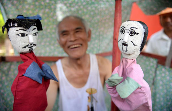 Xiao Qiulin muestra sus marionetas hechas a mano a los espectadores en la ciudad de Nanchang, capital de provincia de Jiangxi, el 1 de agosto de2014.