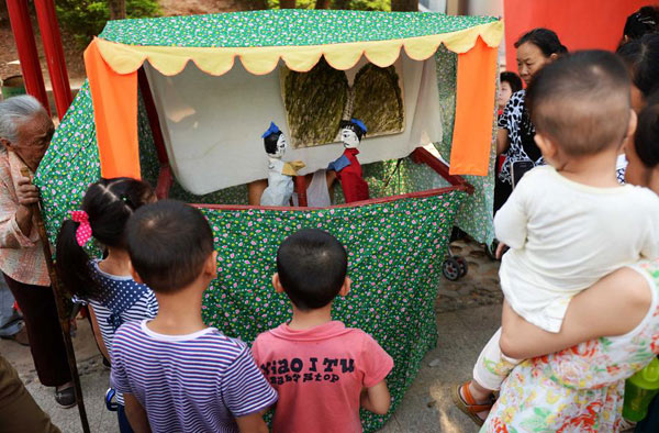 Xiao Qiulin realiza un espectáculo de marionetas dentro de un mini escenario en la ciudad de Nanchang, capital de la provincia de Jiangxi, el 1 de agosto de2014.