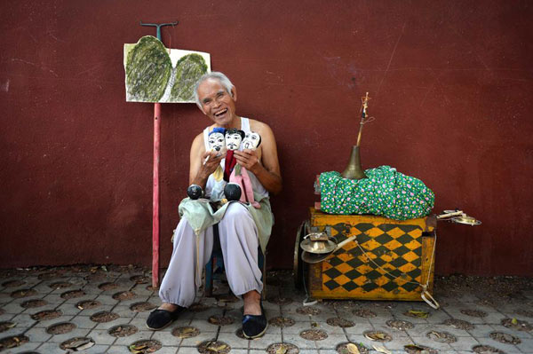 Nanchang, 04/08/2014(El Pueblo en Línea)-Xiao Qiulin, un artista de 65 a?os, posa con sus marionetas hechas a mano en la ciudad de Nanchang, capital de la provincia de Jiangxi, el 1 de agosto de 2014. Xiao se ha ganado la vida haciendo espectáculos de marionetas en las calles durante más de 40 a?os. Frente a un escenario portátil, Xiao es capaz de usar manos, piernas e imaginación para realizar la mejor actuación de marionetas con música folklórica, historias y diálogos. Uno de los deseos del artista es transmitir sus habilidades a las generaciones más jóvenes. Ahora tiene un par de aprendices.