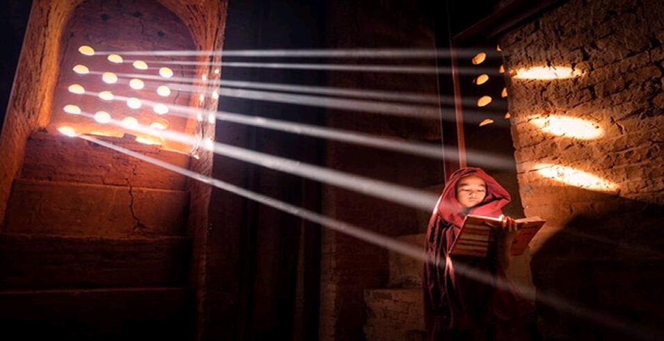 En Burma, un ni?o monje lee su libro en total calma y con buena luz.