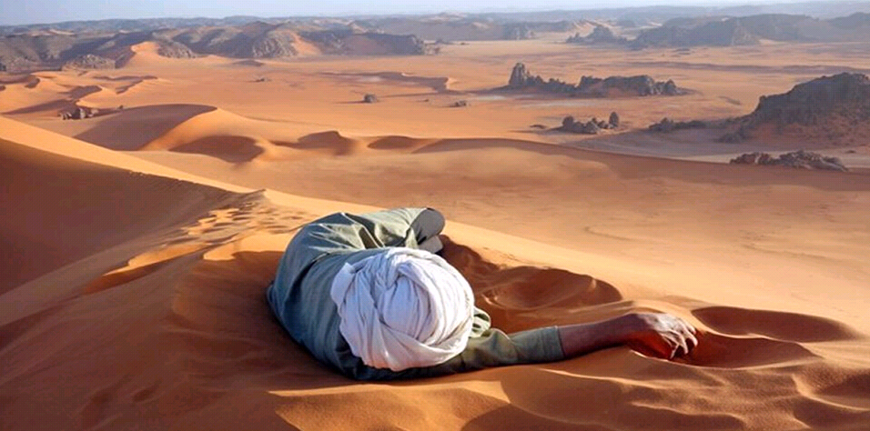 El guía Moussa Macher descansa tras la escala para subir a la duna de arena más larga del mundo, la Tin-Merzouga en el Sahara argelino.