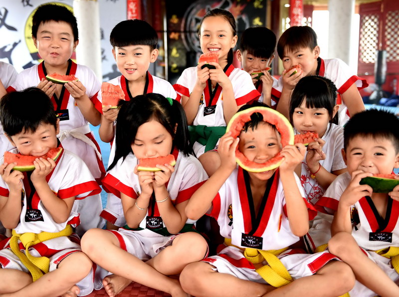 Un grupo de ni?os comen sandías en un jardín de la infancia de Anhui, Haozhou. Comer sandía obedece a una antigua tradición popular de bienvenida para un feliz comienzo del oto?o. El Liqiu, uno de los 24 términos solares tradicionales chinos, es el que marca el comienzo del oto?o. La gente también suele comer duraznos. Al comer el fruto, se augura una pronta despedida del verano y la llegada fresca y cómoda de la siguiente estación.