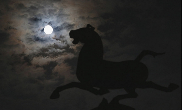 La "superluna" junto a una estatua de la dinastía Han del Este en Huaying, provincia de Sichuan, el 10 de agosto de 2014. El fenómeno astronómico se produce cuando la luna se acerca más a la Tierra en su órbita, momento en que se ve mucho más grande y brillante de lo habitual. [Foto/agencias]