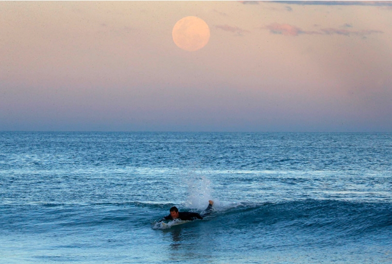 Un surfista sobre una ola con la "superluna" detrás, en la playa Wanda de Sydney, el 10 de agosto de 2014. El fenómeno astronómico se produce cuando la luna se acerca más a la Tierra en su órbita, momento en que se ve mucho más grande y brillante de lo habitual. [Foto/agencias]