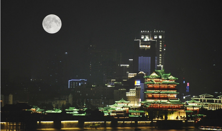 La "superluna" sobre el Pavellón del Príncipe Teng en Nanchang, en la provincia de Jiangxi, el 10 de agosto de 2014. El fenómeno astronómico se produce cuando la luna se acerca más a la Tierra en su órbita, momento en que se ve mucho más grande y brillante de lo habitual. [Foto/agencias]