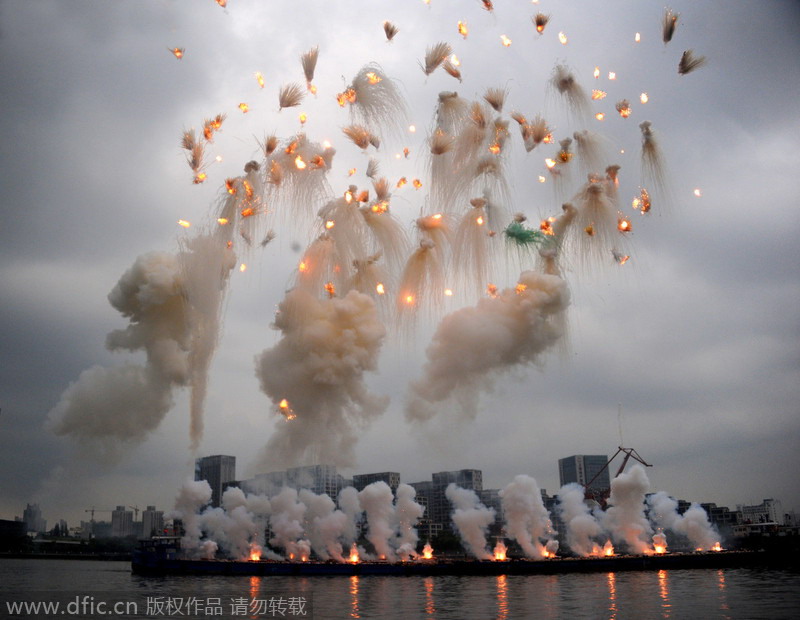 Cai Guoquian exhibe con fuegos artificiales en la ribera del río Huangpuen, en Shanghai. [Foto/IC]