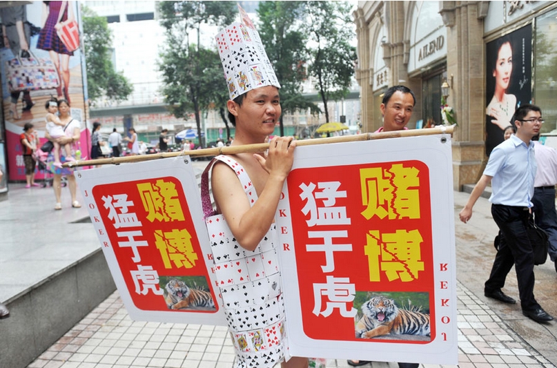 El cartel que lleva Yuan dice "Ama a tu familia y aléjate de los juegos de azar". [Foto/Asianewsphoto]
