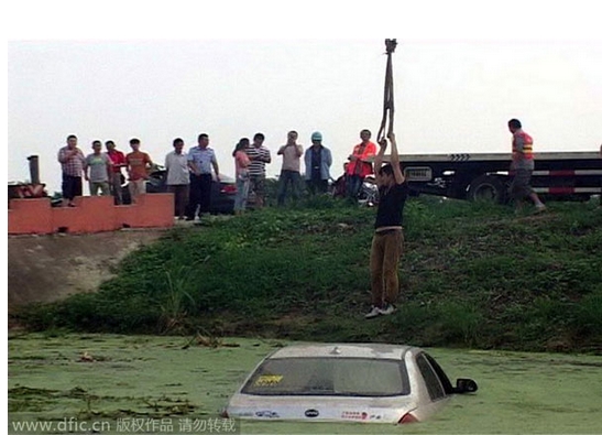 Una grúa lleva a un hombre a un lugar seguro durante el rescate en un río en Nanjing, provincia de Jiangsu, el 10 de agosto de 2014. [Foto/IC]