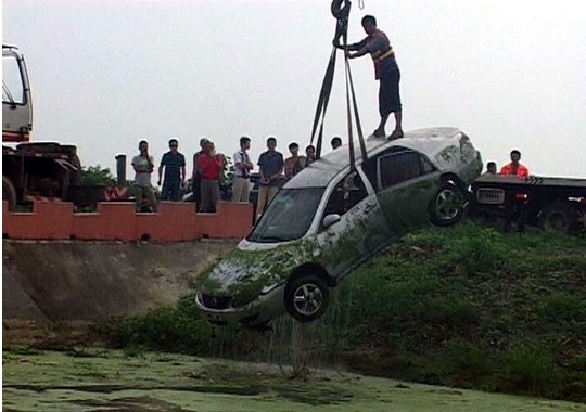 La grúa saca el coche del río con el trabajador encima en Nanjing, provincia de Jiangsu, el 10 de agosto de 2014. [Foto/IC]