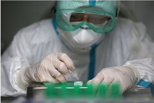 Un miembro del personal médico hace pruebas en un laboratorio, el 11 de agosto de 2014. [Fotografía por XieHao/Asianewsphoto]