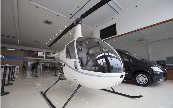 12/08/2014 (El Pueblo en Línea) - Un helicóptero en un concesionario de coches en Hangzhou, capital de la provincia de Zhejiang, el 10 de agosto.