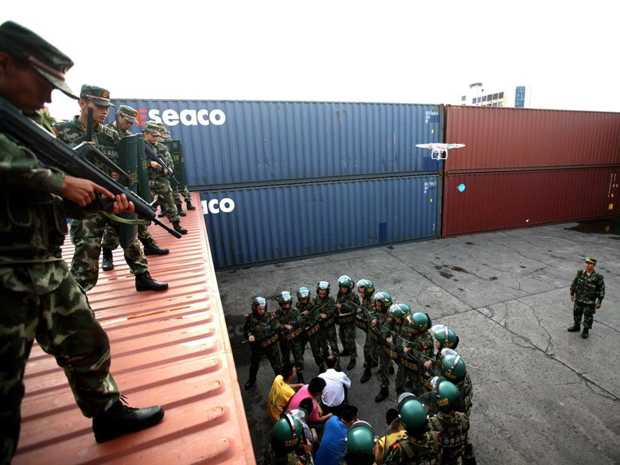 Por primera vez, la policía china realizó un ejercicio antiterrorista utilizando un vehículo aéreo no tripulado (UAV) en una estación de control en la frontera de Shenzhen, provincia de Guangdong, al sur de China. Los UAV se aplicarán posteriormente en las patrullas diarias y manejo de emergencia de la ciudad. [Foto/ PPC]